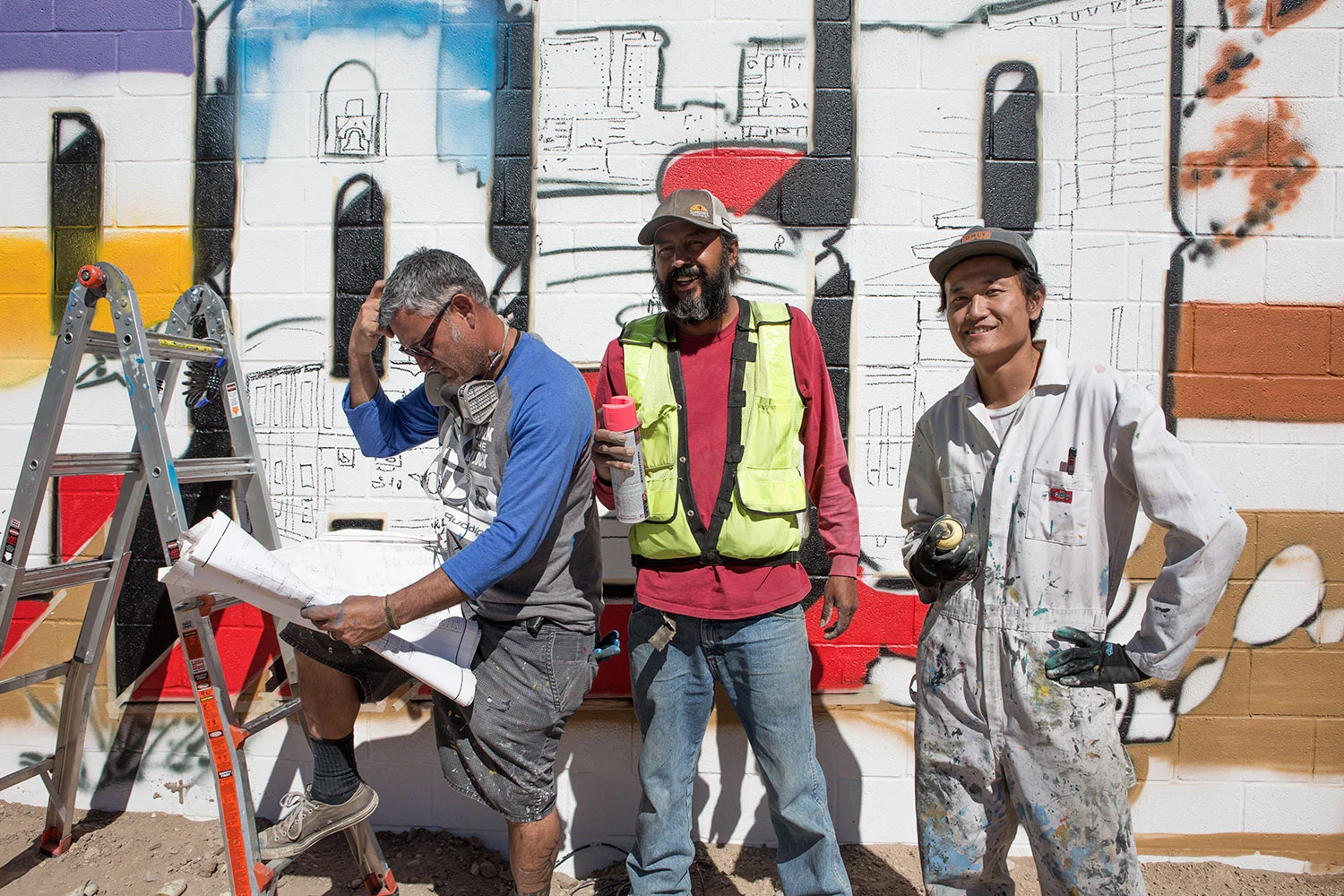 Lisa documented all the mural progress as we worked in the development site surrounded by construction workers. We made friends with the hard-working locals who watched the progress every day. At the same time, we would watch their building progress. It was quite a dusty work site, and we got to experience the brutal El Paso heat. We couldn’t imagine painting here in the summer time without any shade!
