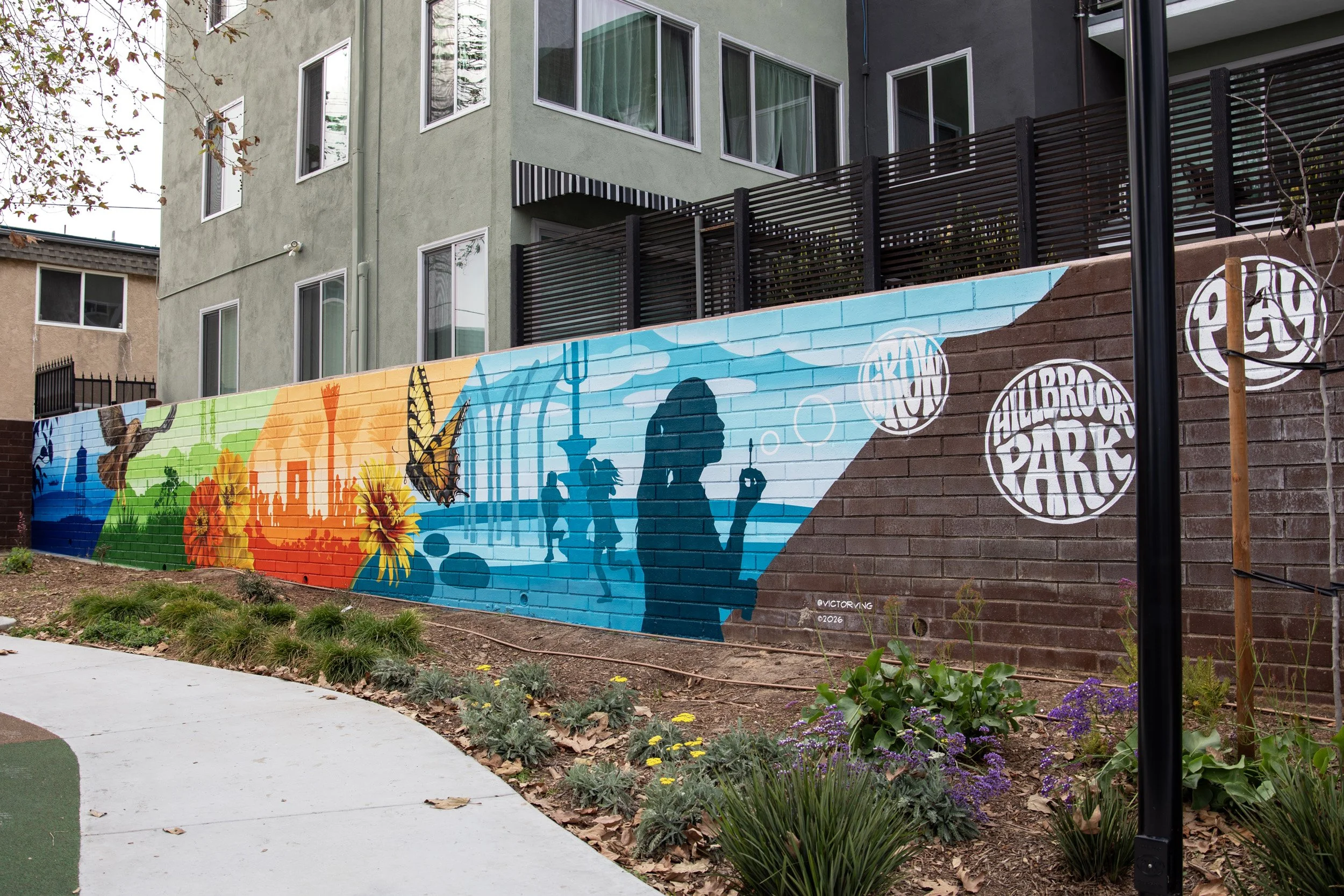 Since becoming a dad, parks and libraries have become part of my everyday routine. They’re no longer just public spaces—they’re where birthdays happen, where kids test their courage on climbing structures, where parents trade stories at the edge of the playground. Over the past few years, I’ve had the chance to paint more murals in parks across Los Angeles, and I’ve seen firsthand how meaningful those spaces can be. So when Signal Hill put out a call for a mural at Hillbrook Park, it felt different. I didn’t hesitate.
