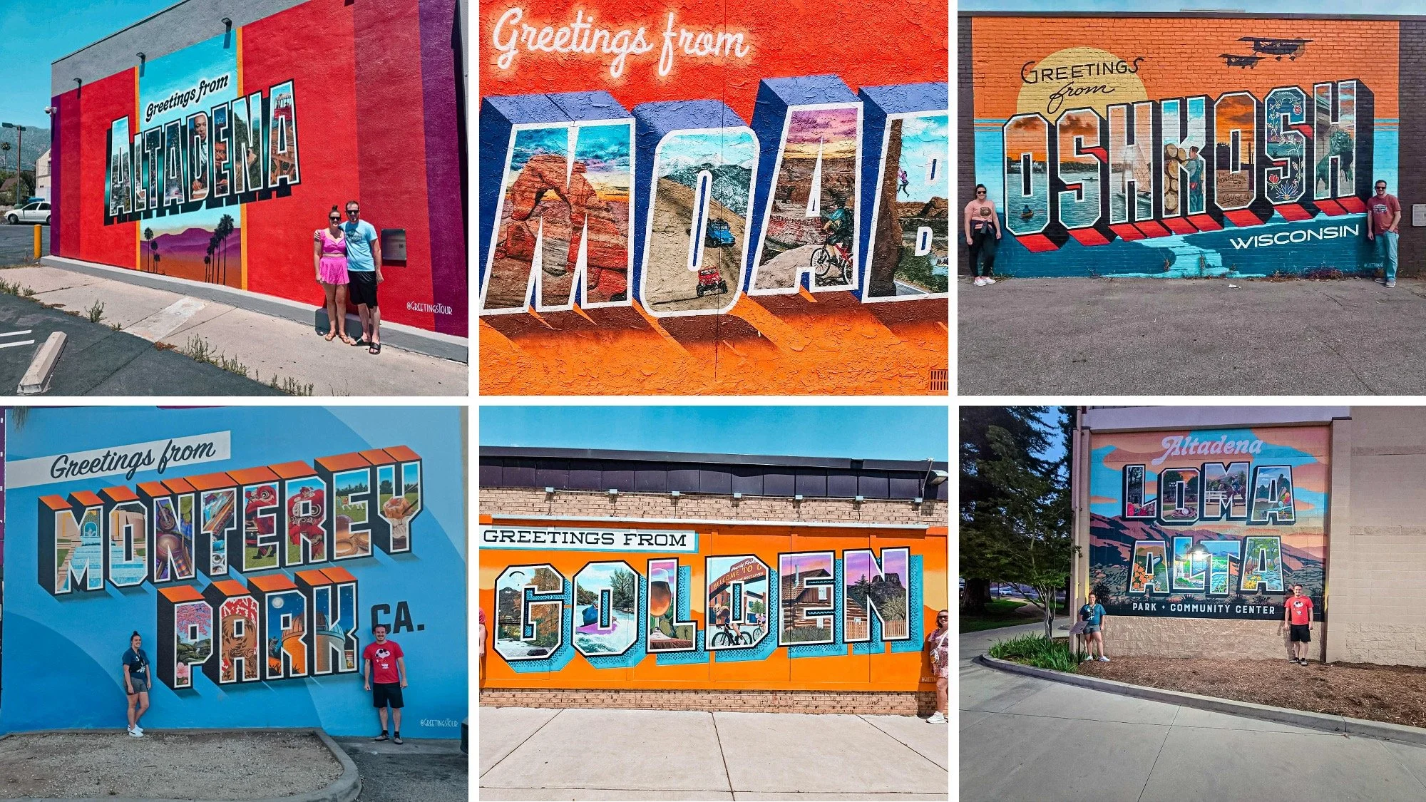 We are impressed by the number of Greetings Tour murals that some of you have visited. A part of our mission is to create a nationwide series of murals that act as a modern day collectible. It‘s a timeless way to share your travels with friends and family just like the original postcards of the mid-century. In addition to being a symbol of hometown pride, our goal is to help create timeless landmarks and bring traffic to local businesses via tourism. We promote responsible travel and encourage you to all support the local small businesses near the murals when possible. If you have photos in front of over 10+ Greetings Tour murals, please send them to us to be featured on this page! We’ll also hook you up with a thank you gift for the support ;)